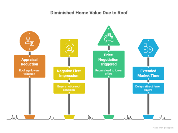 A compromised roof can lead to other problems, water intrusion, mold growth, and damaged insulation, that further erode home value. These secondary issues can balloon repair costs, triggering additional price reductions and inspection delays.